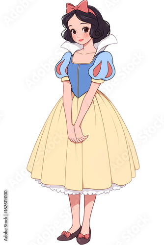 白雪姫の象徴的な赤いリボンと青×黄色のドレスを身にまとった少女の手描きアニメ風イラスト。童話の世界を彷彿とさせるメルヘンで幻想的な雰囲気が魅力の創作素材。