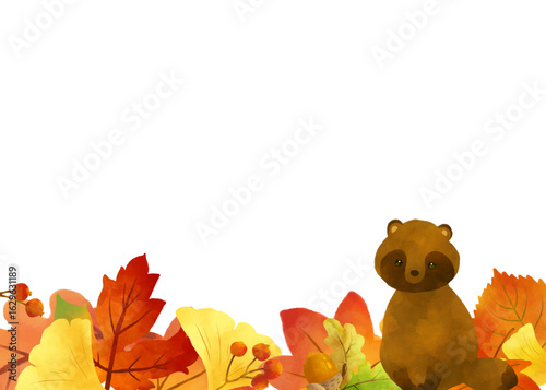 秋色の落ち葉とたぬきの水彩画フレーム