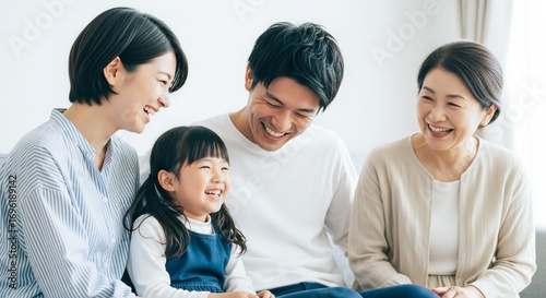 三世代家族がリビングで一緒に笑顔で過ごす団らんの時間
