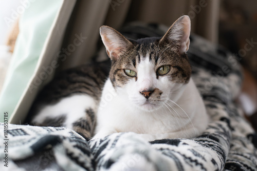 窓辺でくつろぐ猫 キジトラ白