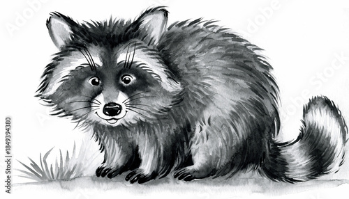 丸い表情が愛らしいたぬきの白黒墨絵