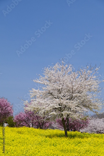 菜の花畑の桜。赤城南面千本桜。前橋 群馬 日本。4月初旬。
