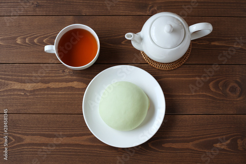お皿にのせた メロン パン 紅茶 木のテーブル