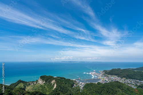 鋸山の山頂展望台から見る金谷港と東京湾の風景