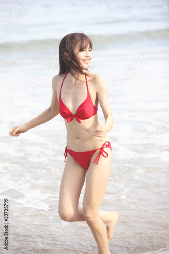ビーチで遊ぶ水着女性