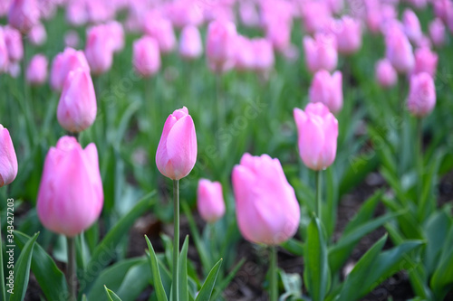 日本の国営武蔵丘陵森林公園のお花畑の早咲きのチューリップが咲く春の風景 ピンク色の花のクリスマスパール
