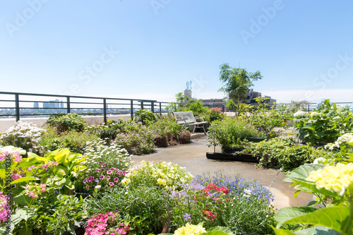 植物で鮮やかな初夏のバルコニー、都会のガーデニング