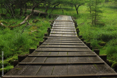 入笠山 朝露湿る木目調の道を行く