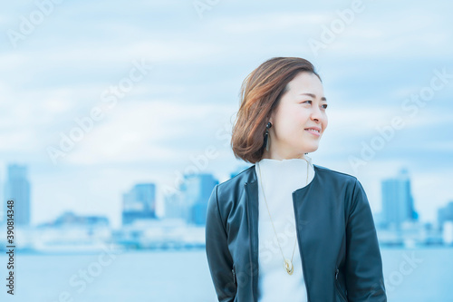 屋外で笑顔を見せるオフィスカジュアルスタイルの女性