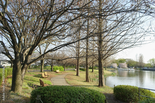 遊歩道とベンチが囲む池/川越水上公園(埼玉県)