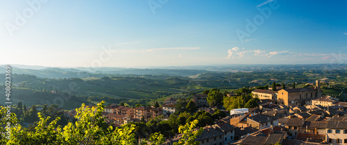 イタリア サン・ジミニャーノのロッカ公園から見えるサンタゴスティーノ教会と郊外の風景