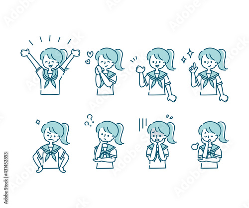 セーラー服(夏服)を着た女子学生の感情表現イラスト(上半身)