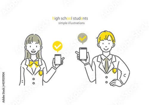 スマホの画面を見せる笑顔の高校生 シンプルでお洒落な線画イラスト