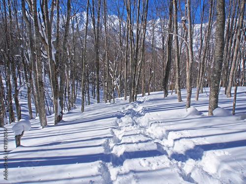 落葉した木々の向こうに見える白い山脈(白馬三山)
