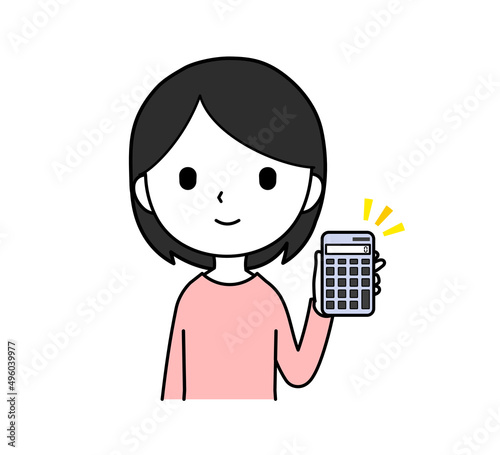 片手に電卓を持つ女性 笑顔 計算 家計 上半身
