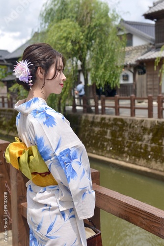 小江戸佐原の町並みを背景に浴衣を着た微笑む若い女性の後ろ姿