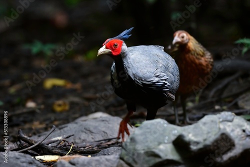 タイやミャンマーの国立公園の熱帯雨林に生息するしま模様と赤い顔が美しいキジの仲間、ミヤマハッカン