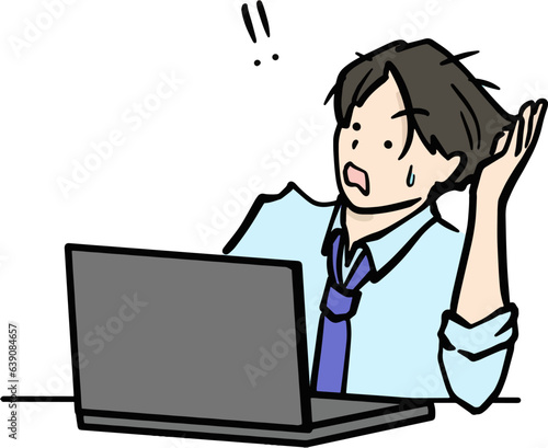 パソコン画面に向かって驚き焦る男性のイラスト
