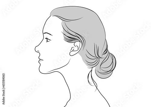 日本人女性の横顔イラスト モノクロ線画の上半身バストアップ