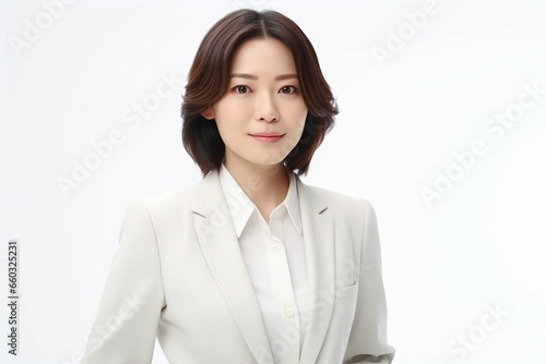 正面の日本人の女性シニアビジネスマンのポートレート写真(白背景・サラリーマン・スーツ・上司・起業家・経営者)