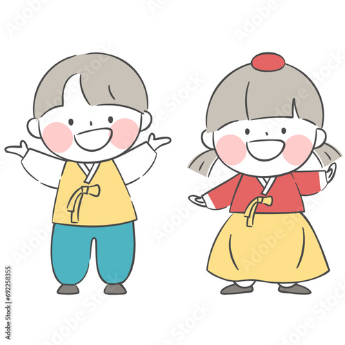 한복을 입은 아이들 캐릭터 일러스트. 웃고 있는 아이들.