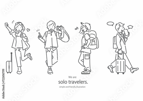 一人旅を楽しむ旅人たち シンプルでお洒落な線画イラスト
