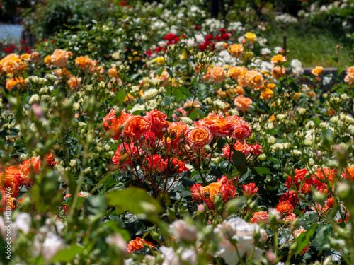 カラフルな薔薇が咲く花壇の風景