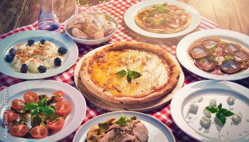 テーブルいっぱいに乗ったピザやサラダや沢山の食事