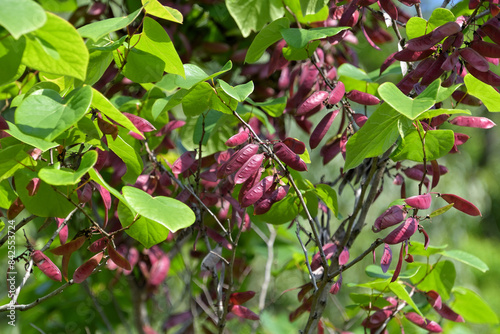 赤紫色に色づいたハナズオウの豆果