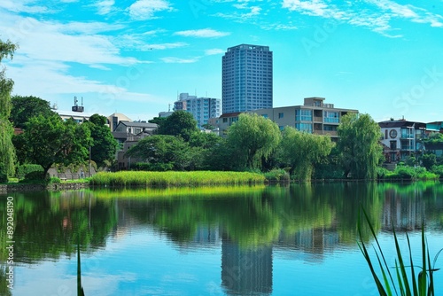 池と新緑と青い空