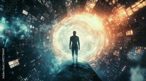 分割画面効果:別の世界をつなぐ量子トンネル、未来的な都市景観、コピースペース