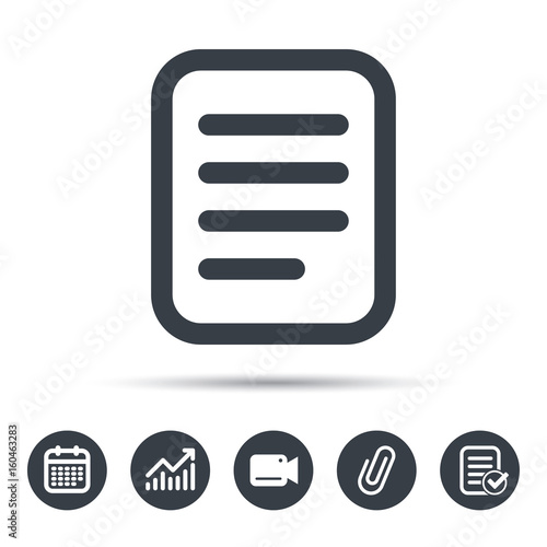 File icon. Text document page symbol. Calendar, chart and checklist signs. Video camera and attach clip web icons. Vector