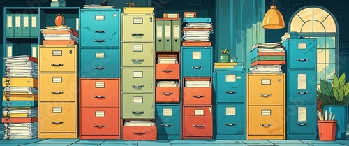 Filing cabinets and stacks of folders background anime retro cartoon concept illustration