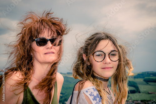 Fillette et femme posant aux pieds de la Tour d'Albon