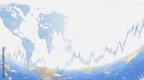 finance Abstract white background uptrend arrow with candlesticks and bar chart show innovation of economy business statistics with Earth network with glowing nodes and triangle polygon linesIt