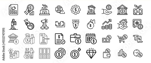 Finance Icons Set Black and White Line Art Dollar Signs Graphs Charts