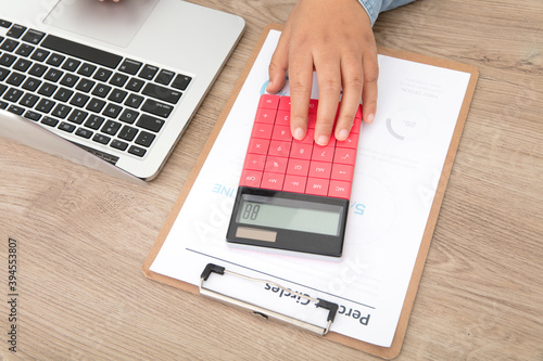 Financial accountant working with calculator and laptop
