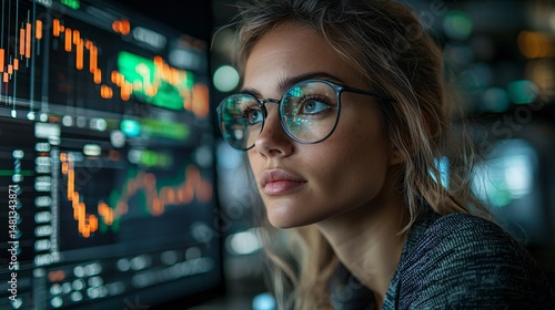 Financial analyst in a futuristic office analyzing market trends with data visualizations