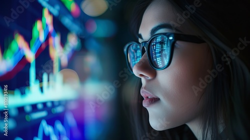 Financial analyst in eyewear analyzing complex data on computer monitor – Professional woman in finance sector