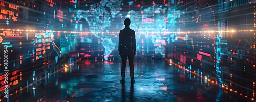 Financial Analyst Reviewing Digital Trading Platform with Futuristic Data Visualization and Networking Concept