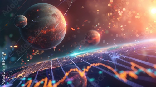 financial planet system, with orbits depicting cycles of investment returns and economic indicators as celestial bodies