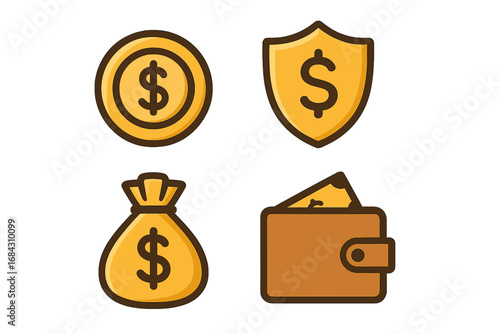 Financial security and money savings icon set. Vector cartoon collection with dollar coin, shield, money bag, and wallet icons for business, banking and insurance design.