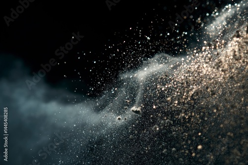 Fine airborne dust forming luminous powder cloud against shadowy black backdrop clustered