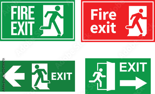 Fire exit symbol with running person and arrow, flat vector design in green and white, safety sign concept