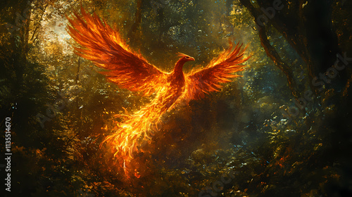 Firebird reborn from ashes in a mystical forest, vibrant flames, eternal cycle. mystical. illustration. Eternal. Illustration