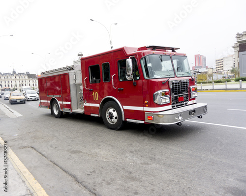 Firetruck speeding down a street to a call.