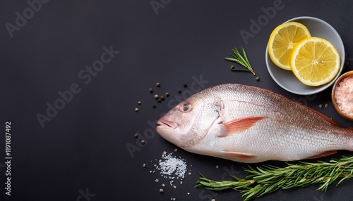 fish on a cutting board. Fish raw snapper with lemon slices, herbs rosemary, salt and pepper on dark background.