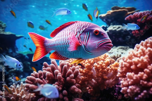 Fish over a coral reef in the sea.