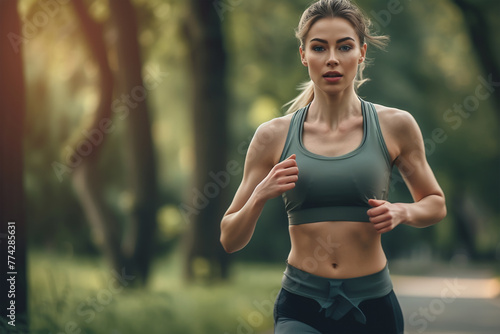 Fit woman jogging outdoors on a paved path through a sunlit park during early morning exercise.