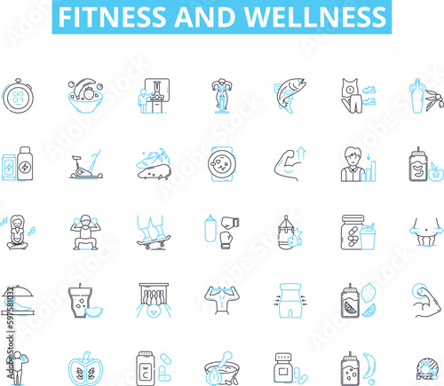 Fitness and wellness linear icons set. Exercise, Health, Strength, Endurance, Flexibility, Balance, Nutrition line vector and concept signs. Workouts,Wellness,Yoga outline illustrations